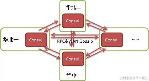 微服务平台API网关是服务注册中心最重要的使用方之一。网关会根据地区、运营商等因素部署多个集群,每个网关集群会根据内网位置对应到一个Consul集群,并且从Consul查询最近的服务实例,如下图所示。