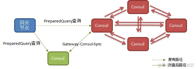 目前API网关的正常工作依赖于Consul PreparedQuery查询结果在本地的缓存,目前的交互方式有两方面问题: