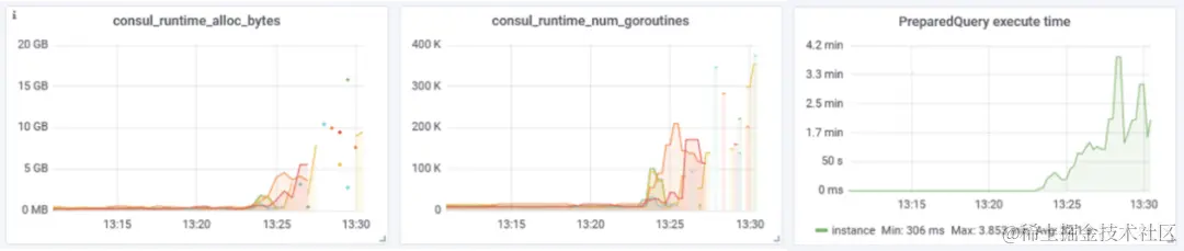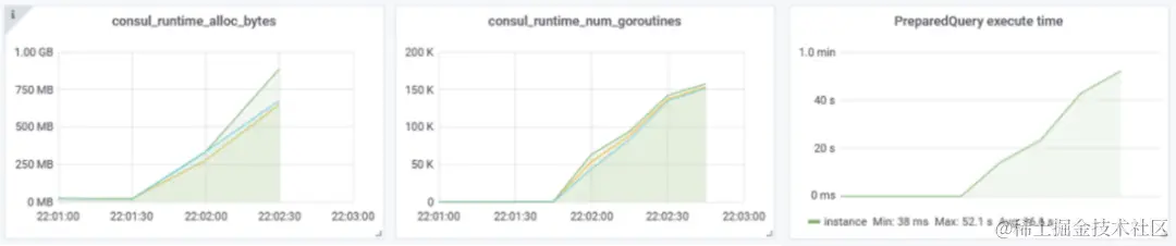 1. 当DC间RTT由正常的2ms变为800ms之后,Consul Server的goroutine、内存确实会线性增长,PreparedQuery执行耗时也线性增长,如下图所示;