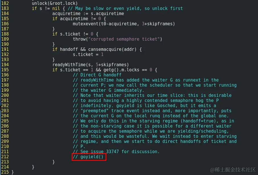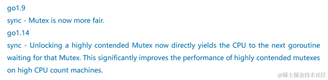 回顾语言的更新历史,go1.9版本添加了公平锁特性,在原有normal模式上添加了starvation模式,来避免锁等待的长尾效应。但是normal模式下新的goroutine在运行时有较高的几率竞争锁成功,从而免去goroutine的切换,整体效率是较高的;而在starvation模式下,新的goroutine不会直接竞争锁,而是会把自己排到等待队列末端,然后休眠等待唤醒,锁按照等待队列FIFO分配,获取到锁的goroutine被调度执行,这样会增加goroutine调度、切换的成本。在go1.14中针对性能问题进行了改善,在starvation模式下,当goroutine执行解锁操作时,会直接将CPU时间让给下一个等待锁的goroutine执行,整体上会使得被锁保护部分的代码得到加速执行。