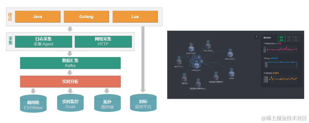 链路追踪的基本原理也和google关于Dapper的论文一致,应用程序通过埋点的agent产生调用链数据,通过日志采集或者网络直接上报的方式统一汇总至kafka,通过我们的实时分析程序进行分析。分析结果大致可以分为三类,原始的调用链数据我们会使用ES+HBase进行存储,调用关系上的实时监控数据我们采用时序数据库druid进行存储,拓扑关系采用图数据存储。