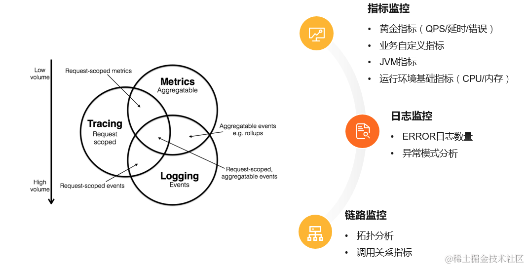 1.指标监控:包括QPS/响应延时/错误率等黄金指标、业务的自定义指标、JAVA应用的JVM指标,此外还需要采集和基础环境的相关指标,包括CPU/内存利用率等;