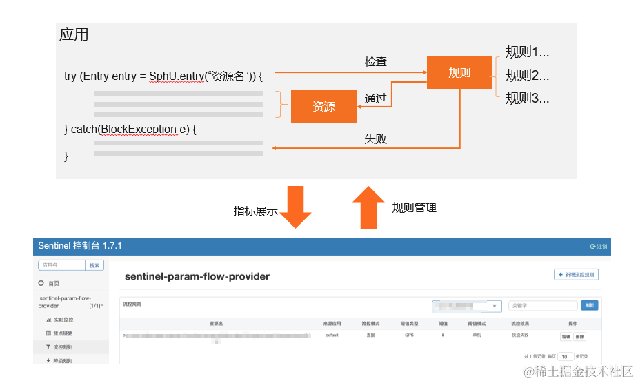 由于微服务架构的特点,上下游依赖和网络通信都比较多,这些因素都会对应用本身产生一定的风险,比如上游系统的突发流量或者热点参数;下游系统服务不可用、延时增大、错误率升高等等。如果缺少对自身系统的保护,有可能产生雪崩的效应。为了应对这些场景,我们主要引入了Sentinel框架进行解决。Sentinel的核心原理是用户可以定义各类资源(资源可以是本地的一个接口,或者远程的某个依赖),并在资源上设置各种规则(比如限流规则),在访问某个资源时,Sentinel组件会检查这些规则是否满足,在不满足的情况下会抛出特定的异常。用户可以通过捕捉这些异常实现快速失败或者降级等业务逻辑。Sentinel还提供了一个控制台,可以用来管理规则的参数设置以及查看实时监控等。