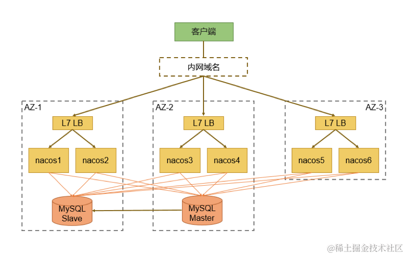 在部署Nacos服务时,我们充分考虑了服务部署架构方面的高可用性。目前我们的Nacos服务是一个大集群,实例分布在多个不同的可用区中,在每个可用区内部,我们会申请不同的VIP,最终的内网域名是绑定在这些VIP上。另外其底层所使用的MySQL也采用了多机房部署。这样的架构可以避免单个Nacos实例或者单机房故障造成整个Nacos服务的不可用。以下是一些可能的故障场景的模拟: