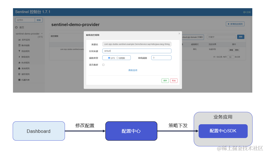 为了实现规则参数的动态下发,我们将sentinel与内部的配置中心进行了适配。在sentinel dashboard上进行的参数改动,最后都会保存至配置中心,业务系统通过引入配置中心的SDK,即可实现在不重启应用的前提下进行参数的动态调整。