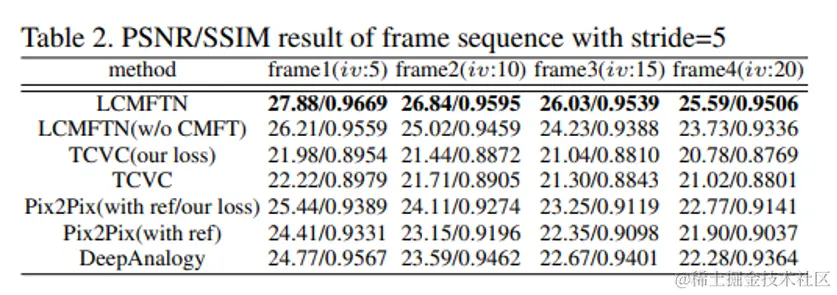 文章对LCMFTN模型在7部真实动画电影数据上进行测试,分别在小运动和大运动情况下对连续片段上色进行了对比,在PSNR和SSIM指标上效果均明显优于目前的主流state-of-the-art 方法(包括TCVC[4],DeepAnalogy[2],Pix2Pix[5]等)