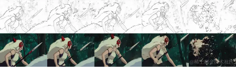 上图这5帧幽灵公主的上色画面中,你能找出哪张图是AI画的,哪张是人类画师画的吗?\