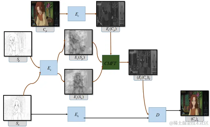 的上色帧。作者设计了一个名为CMFT的结构来将参考帧的颜色特征变换到待上色帧,这个结构也可以用到其他image analogy问题上。