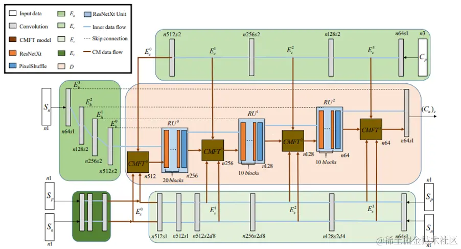 爱奇艺的研究者将CMFT模块嵌入到上色生成网络中,网络简化图如图三,其中为参考色图,