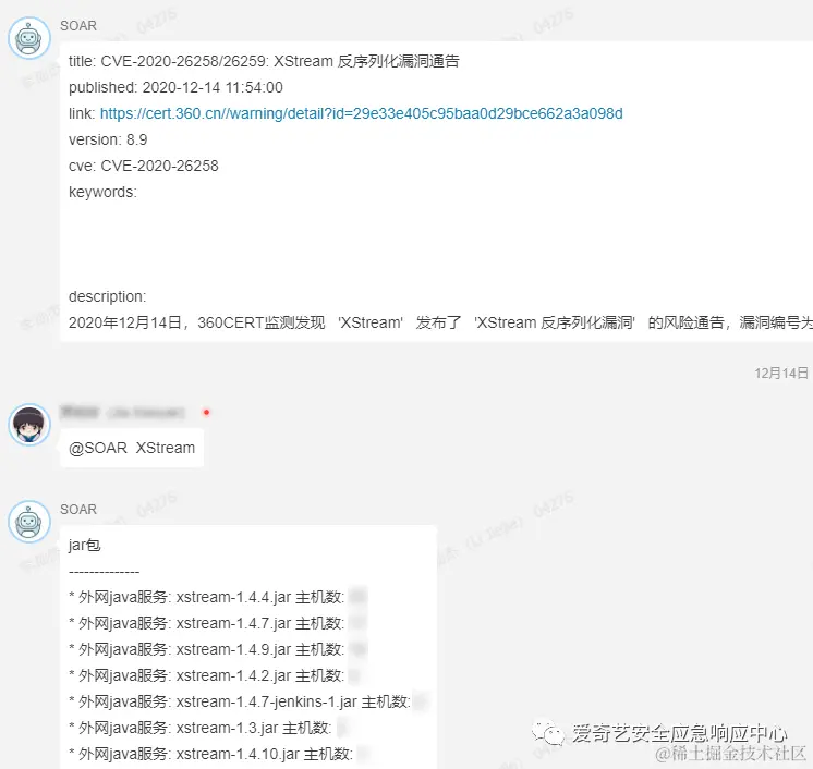 - 针对移动端开发了对应小程序及群聊机器人,方便安全人员在移动端可以通过公司内部聊天软件实现ChatOPS及快速安全应急响应。群聊机器人,方便安全人员进行ChatOps。