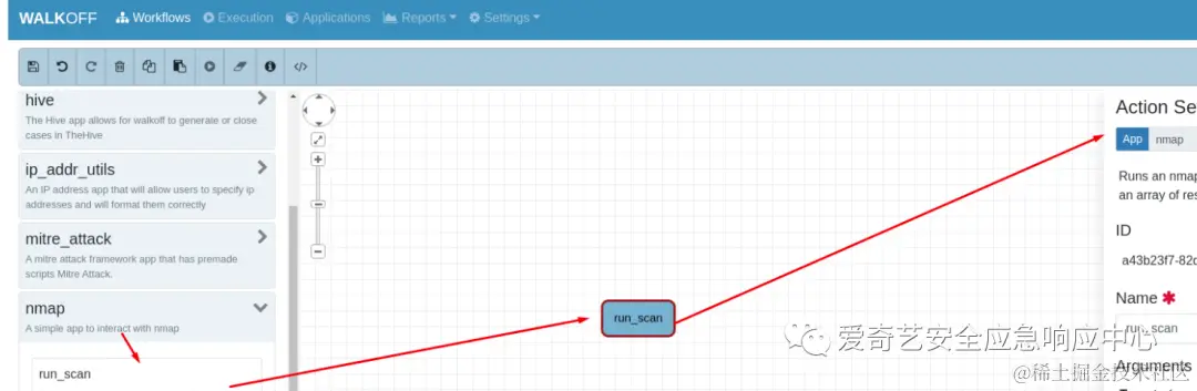 Stackstorm附带的图形编排引擎需要单独收费,不太适合二次开发, 我们集成了NSA开源的Walkoff系统的前端,作为图形编排界面。 \