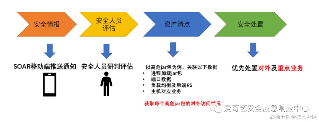 以高危jar包漏洞通报为例,通常这类漏洞危害较大,且在短时间内推动所有业务完全修复较为困难。我们通过SOAR及相关资产清点,优先处置对外及重点业务的高危jar包,保证企业相关业务安全。