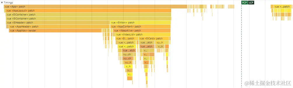 - Timings:包括 FP、DCL、FCP、LCP 等指标,以及通过 Performance API 记录的运行时间。Vue.js 2.x 中可以通过 Vue.config.performance = true; 开启组件性能记录。下图的截图展示了 Vue.js 组件的渲染耗时情况。