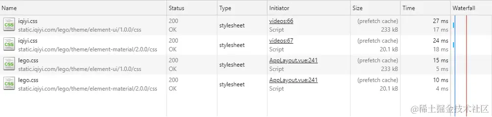 - 单独部署样式主题至 CDN。项目中用到的 ElementUI 组件样式及团队内部开发的 MaterialTheme 主题样式放弃从 NPM 引入 Sass 源码。而是提前构建好 9 种不同颜色的主题,提前部署至 CDN,并通过 prefetch 提前加载。项目中的自定义样式则通过 Sass Mixin 生成不同主题的规则。