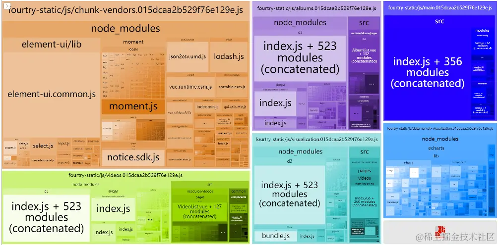 - 重复打包。部分业务模块对应的 chunk 文件原始大小在 500K 左右。其原因是使用到了 d3,echarts 等依赖的模块,直接将它们打包到了对应模块中。而这些第三方库,占整个文件大小的 70% 左右。