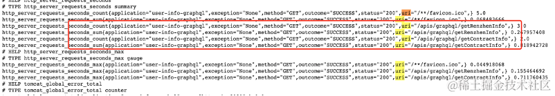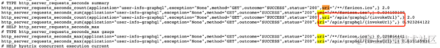 在user-info-graphQL项目中,原本是通过template url来匹配任意自定义url;导致监控平台只能显示template url的请求信息,如图3-3所示。这个问题可以通过重写spring-boot-actuator中获取tags的方法,将真实的url请求信息暴露到Spring boot的/actuator/prometheus端点这个方法来解决,如图3-4所示。