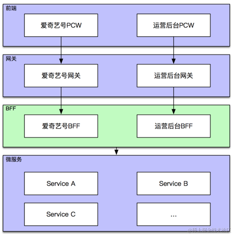 爱奇艺号在实施微服务化的过程中,加入了BFF的前后端架构,如图2-1所示: