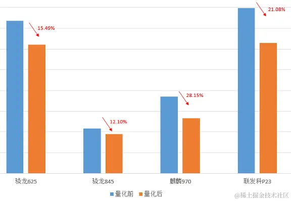 因为浮点型数据在移动端计算很慢,我们使用TensorFlow对算法模型进行了Quantization-aware training的训练,新版的TensorFlow对量化的支持很完善,只要在训练代码中加入两行代码即可完成量化训练,我们先通过正常的训练获得收敛的模型,再对其进行量化训练。在高通骁龙,华为麒麟和联发科Helio等主流芯片上的CPU推理速度改进如下表: