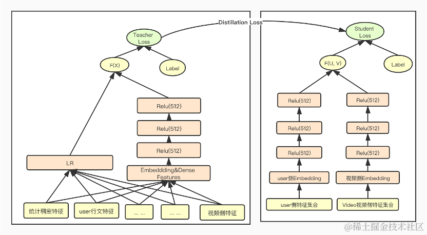 将粗排模型和精排模型放到知识蒸馏的teacher-student框架中,以蒸馏训练的方式来训练粗排模型,以精排模型为teacher来指导粗排模型的训练,从而得到一个结构简单,参数量小,但表达力不弱的粗排模型,蒸馏训练示意图如图三所示。
