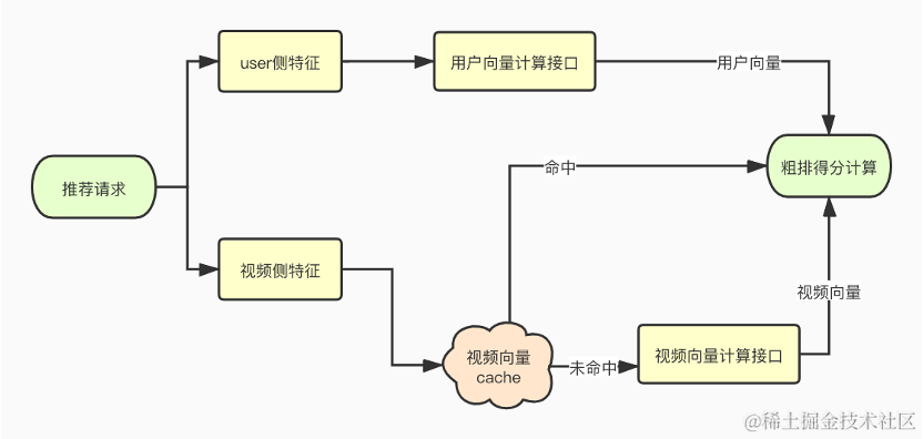 此外,基于视频推荐时特别长尾的分布,以及如前文所述,粗排模型视频侧的特征全部是静态特征(视频id确定,特征也是确定的),我们对高频视频的embedding进行了缓存。视频侧embedding优先从缓存里查询,未命中缓存时再进行inference计算。优化后的粗排打分服务架构如下图五所示: