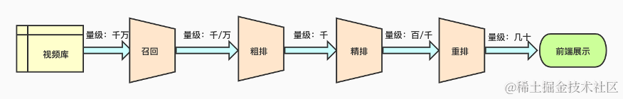 工业界的推荐系统通常包括召回、粗排、精排以及重排四个阶段,如图一所示,每个阶段都像是一个漏斗,从海量的物品集合中过滤出用户最有可能感兴趣的物品。其中粗排模型发挥的主要作用是统一计算和过滤召回结果,在尽量保证推荐准确性的前提下减轻精排模型的计算压力。本文主要介绍爱奇艺随刻基础推荐团队在短视频推荐业务的粗排模型优化上落地的一系列实践方案。