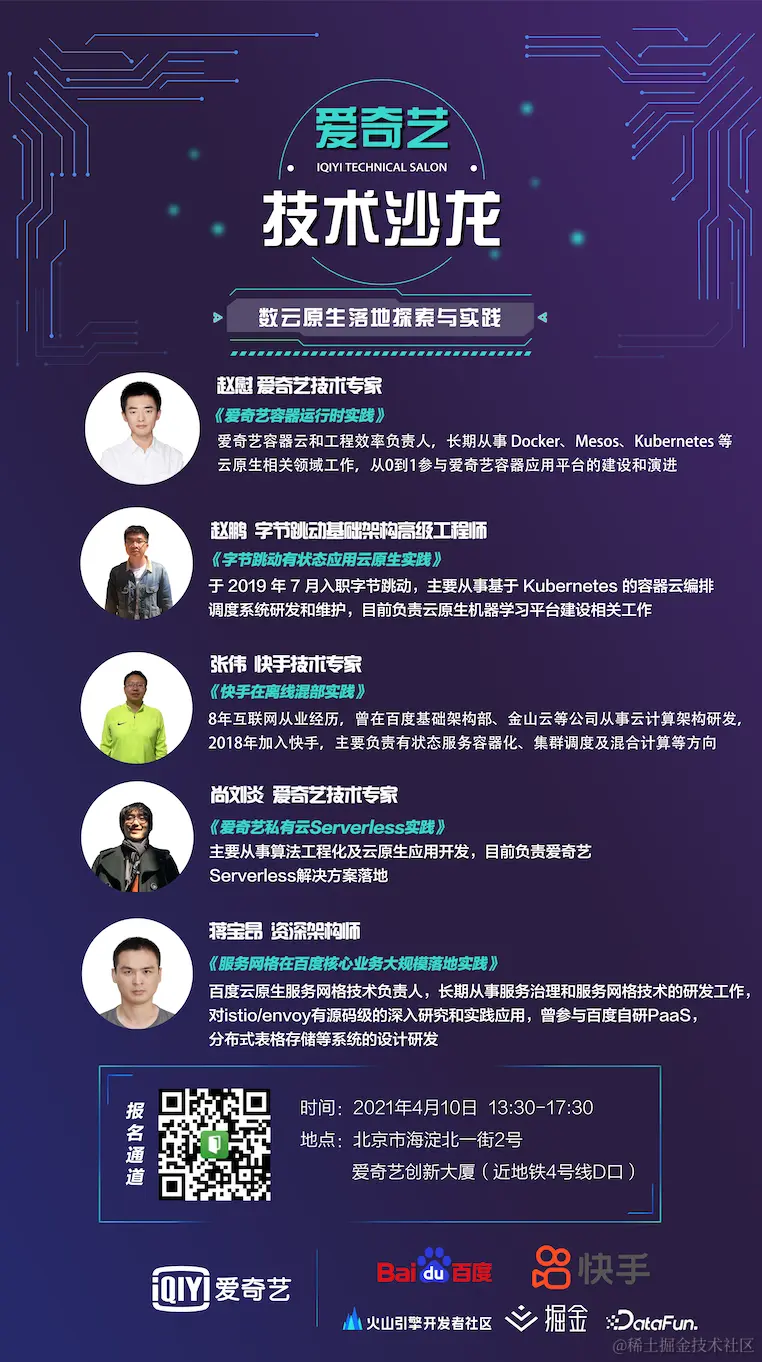 借此机会,我们邀请到来自爱奇艺、百度、快手、字节跳动的几位资深的工程师,明天下午1:30,同大家一起探讨云原生之道,云原生落地之器。