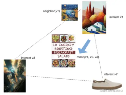 PinnerSage聚类多兴趣召回是传统ii召回基础上结合聚类方法的新型策略。传统的ii召回中往往有两种做法:1,选择用户短期历史行为的每个视频,进行多次ANN查找选出近邻视频,这样的做法不仅时间成本高而且推出视频同质化严重。2,将用户短期历史行为的所有视频embedding进行pooling形成代表用户的user embedding,再进行ANN近邻查找,这样的方式能一定程度的融合信息减少时间空间代价,但很容易造成信息损失, pooling出的embedding如图3所示很可能差了十万八千里。