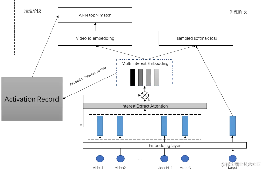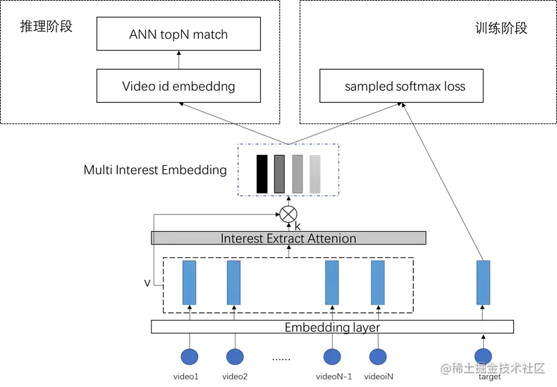 c. 模型训练好后在推理阶段,取出用户所有兴趣向量,逐个进行ANN检索得到召回结果。