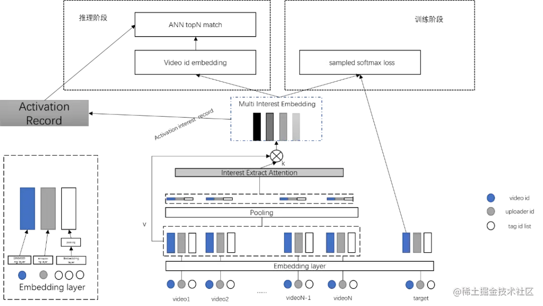- loss部分依然只对视频id的embedding进行负采样(与MIND等结构不同),这样的目的是让视频id的全部embedding可以进入负采样中,而不用折中使用batch内负采样,能够让最终推理阶段主要使用video id embedding更加精准(推理阶段ANN部分不会使用tag与uploader)。