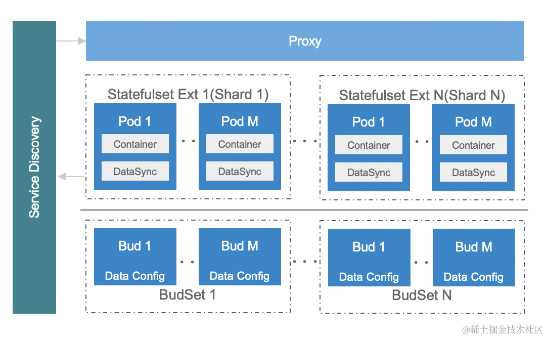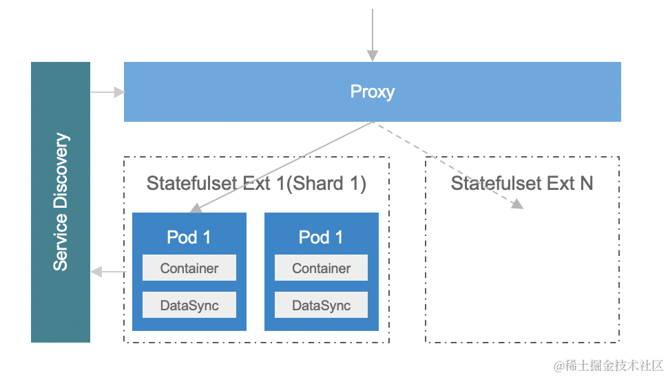 图中有一个 Proxy 业务层的组件,会统一分发请求,将请求分配给对应 Statefulset Extension 的 Pod。同时,同一个 Shard 里面存在多个 Pod 副本,由于宿主机微小的性能差异或其他原因,它们的错误率也不是完全相等的。这里就可以来做第二层路由逻辑,根据一个 Statefulset Extension 内 Pod 的错误率,进一步增强服务路由/熔断逻辑。基于这种复杂的定制的逻辑,我们并没有依赖 K8s Service 来对请求进行路由,而是通过自研的服务发现基础设施注册宿主机上的 IP 和端口,通过 KV 的方式写到 Service Discovery 这个组件里面。