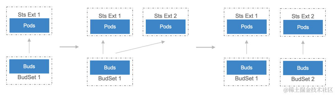 这时其实有一个问题:在 Budset 变更的时候,两个 Statefulset Extention 的 Pod 里的数据依然是全量的。这个时候我们跟业务框架有一些配合工作,有一些业务可能自己定义了数据退场 TTL 逻辑,这时只要等待数据冷却就可以了。此外,还有些业务自定义触发数据的 Compaction,把多余的数据驱逐掉。