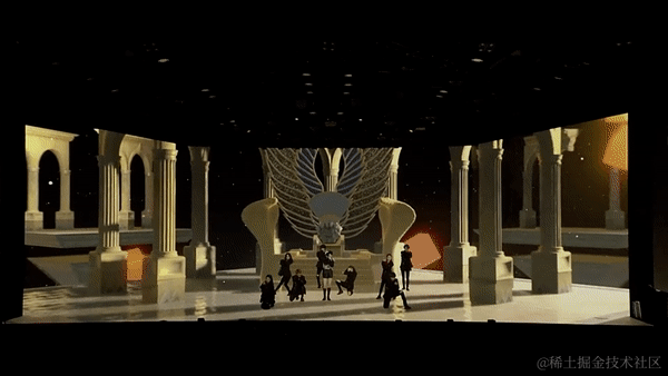 从另一方面来说,传统的LED屏作为节目背景,大多使用抽象的氛围素材,例如多彩的色彩、几何图案等,表现风格化的效果,呈现难度较小。而此次“云演出”虚拟拍摄的LED屏显示的内容则是真实的三维场景,这样写实化的三维场景在屏幕上的渲染是符合透视原理的,即由摄像机看到的画面与人眼看到的真实世界的画面一样。
