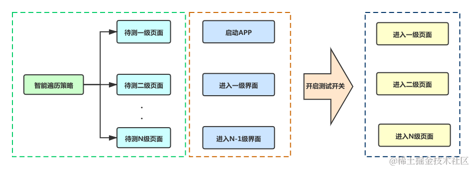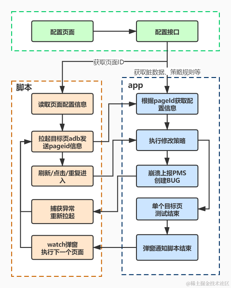 执行流程:配置策略>安装APK>进入启动页>填写策略ID>进入被测页>缺陷分析>自动缺陷管理。