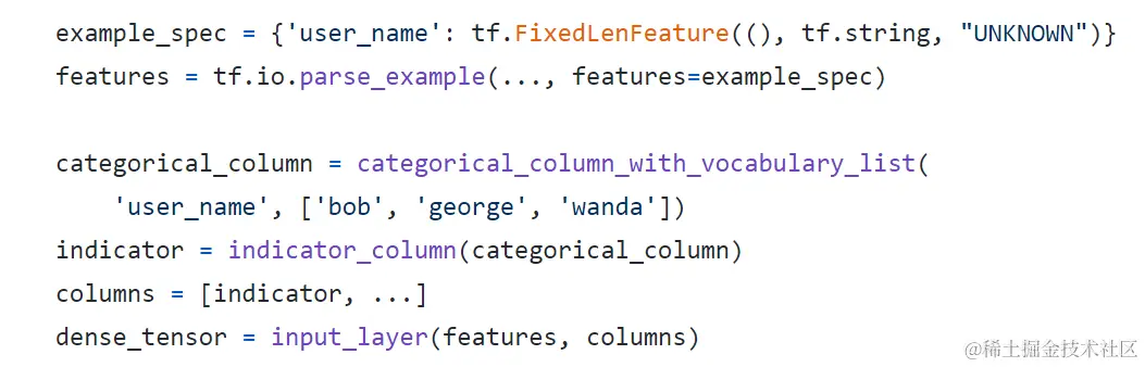 定长特征是指使用接口`tf.io.FixedLenFeature`来解析的特征,比如用户的性别,年龄等,这类特征的长度通常都是定长的,并且固定为 1 维或多维。这类特征经过接口`tf.io.parse_example` 解析成 Dense Tensor,然后经过Feature Column处理,再进入到模型的输入层。常见的代码示例如下: