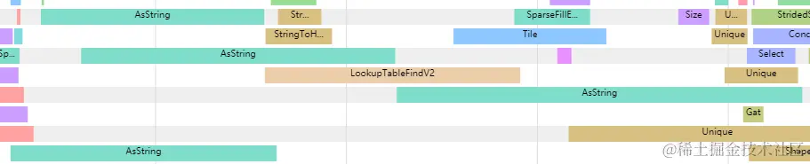 在推荐业务中,通常这类ID都是已经过某种方式的哈希,形成64bit的整型特征放到样本里面,因此必然要执行整型转化成String的操作。但是在TensorFlow 的 Timeline中可以看到函数`as_string`所对应的TF内部的`AsString` OP其实是一个比较耗时的操作,经过分析对比发现`AsString` OP的耗时通常是后面的哈希操作的3倍以上,如下图所示: