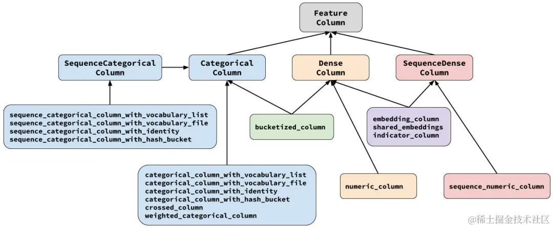 如上图所示,所有Feature Column都源自FeatureColumn类,并继承了三个子类CategoricalColumn、DenseColumn和SequenceDenseColumn,分别对应稀疏特征、稠密特征、序列稠密特征。算法人员可以按照样本特征的类型找到对应的接口直接适配。