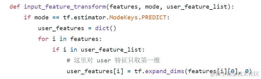 如上图所示,第一阶段的时候用户特征的输入还是重复多次,在模型中,对用户特征只取第一维再进行特征处理,示例代码如下: