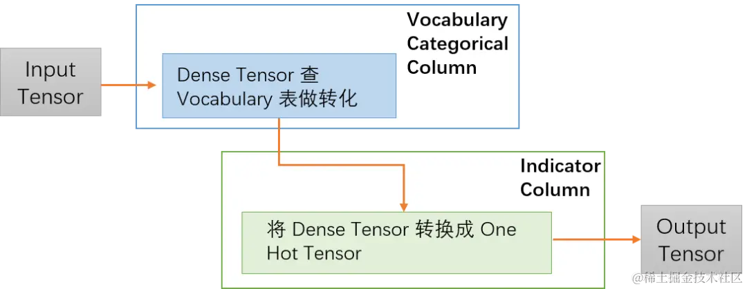 如上图所示,在代码中Vocabulary Categorical Column 会先去除掉一些非法值,然后把输入的Dense Tensor 转换成 Sparse Tensor,在Indicator Column中会再次把Tensor从Sparse转成Dense,最后转成需要的One Hot Tensor。