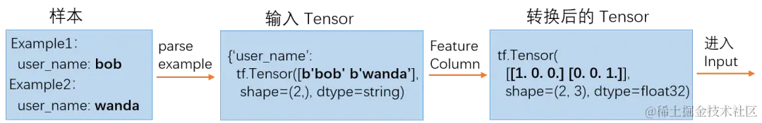 以上面的代码为例子,举例解析一下 TensorFlow 内部的Tensor 转换逻辑。如下图所示,两个样本user_name分别为bob和wanda,经过样本解析成shape为2的Dense Tensor,然后经过`categorical_column_with_vocabulary_list`转换,查找词表分别转成0和2,再经过`indicator_column`转换成One hot编码的Dense输入。