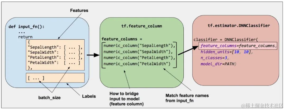 下图是一个使用Feature Column处理特征,进入到 Estimator DNN Classifier的示例: