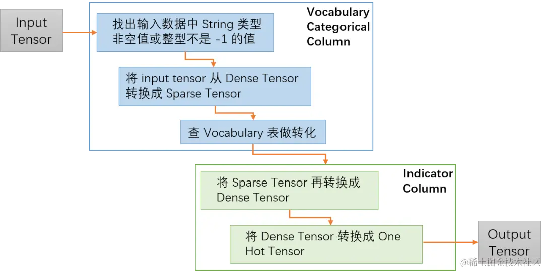 先来思考一下上面两个转换操作的目的,一方面是为了去除样本数据中一些异常的值,另外一方面是这样的处理其实是同时兼顾了输入是 Sparse Tensor 的情况,如果输入是Spare Tensor就直接做Vocabulary词表查找,然后再转成Dense Tensor。这样转换虽然达到代码复用的作用,但是在性能上却有损失。如果能直接将原始的Input Tensor转换成One Hot Tensor,就可以省去两个转换过程,而且Sparse Tensor 和Dense Tensor之间的转换其实是非常耗时的操作。