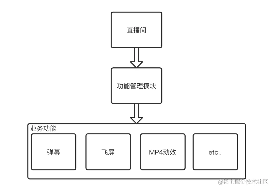 针对功能模块初始化耗时问题,我们在直播间抽象了一个功能管理模块, 一方面是控制模块的加载时机,另一方面可以将功能模块与直播间解耦。 如图: