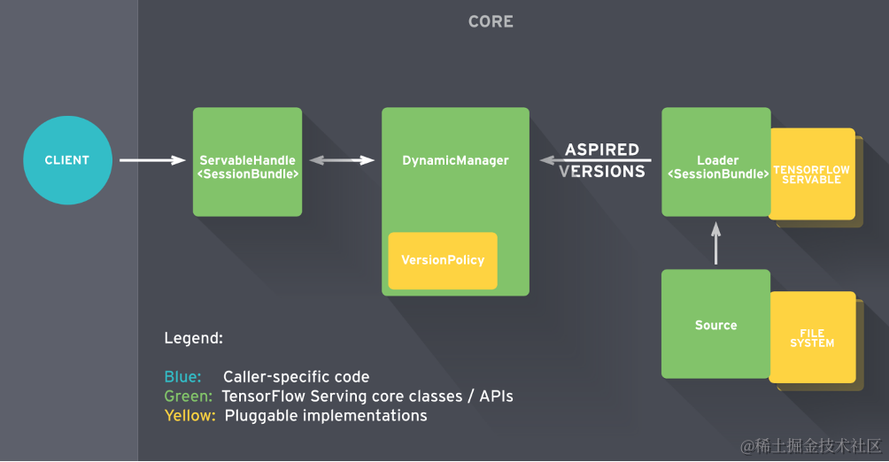 Manager 根据配置的 Version Policy 执行加载新 Version 或者卸载旧 Version 的操作。Client 通过 Manager 来访问 Servable,可以访问指定版本的 Servable 或者缺省访问最新版本的 Servable。