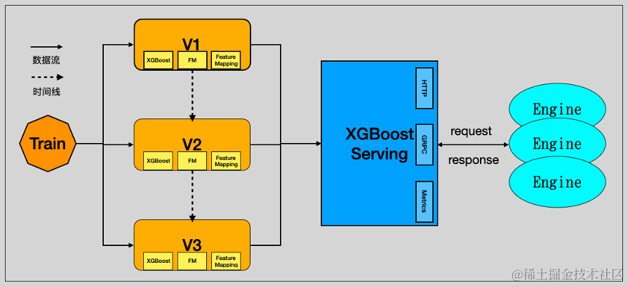 有了 XGBoost Serving 推理系统后,推荐中台可以将模型部署及模型生命周期管理部分托管至 XGBoost Serving,自身聚焦于引擎业务逻辑调用。