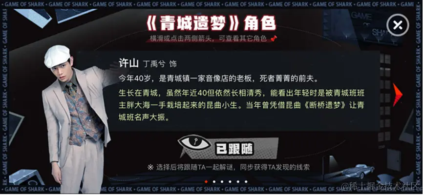 每期《剧本鲨》界面上都会漂浮着一个 “鲨娱模式” 的气泡,点击后,屏幕上就会出现角色选择的H5界面,观众可以浏览每个角色的简介,最终锁定一个,点击 “跟随TA” ,正式进入鲨娱模式。