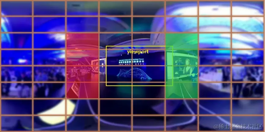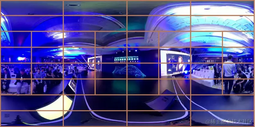由于目前的编码技术基本都是针对矩形图像块来编码的,那么我们可以把原图做一个4x4分割,将每个小块独立编码。如果原图是8K的(7680x4320),则每个分割后的小块刚好是1080P的。这样一来,似乎我们只需要判断用户当前的视口在哪里,覆盖了几个小块,然后仅仅去解码这几个小块,渲染到窗口上就可以了。
