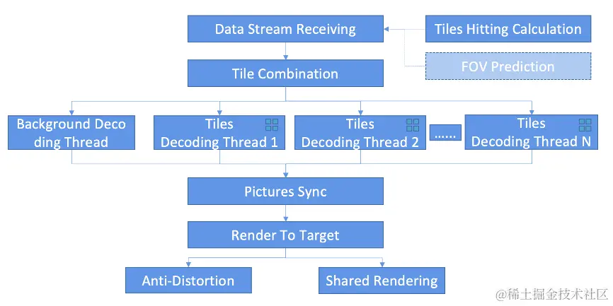 整个解码渲染的架构如上图所示,数据接收下来后,首先根据用户此时的姿态进行命中Tile的计算,得到当前视口内的Tile编号列表。然后将Tile进行组合,2x2或2x3等方式。 接下来,将每个组合好的Tile送给对应的解码线程, 多线程并行开始解码。各解码器输出的帧,进行pts同步之后,最终输送给渲染器。渲染器做反畸变渲染,或直接渲染。