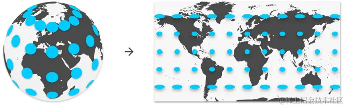 降低码率还可以通过改变投影方式来实现。 传统的ERP(Equirectangular Projection)投影方式,南北极区域被极大的拉伸了,造成很多的像素冗余,给编码带来了额外的码率。