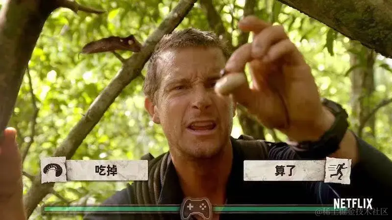 看惯了野外生存达人贝爷上山下河、吃虫求生的画面,你有没有想过,当这种“残酷”的选择需要由你来做出的时候,或许作为观众就不会在如此轻松惬意了。而这种扣人心弦,恰恰就是互动内容所体现出的精妙所在。 一改“置身事外”的观看,Netflix的真人秀《贝尔对抗荒野》就通过这种互动的形式,让观众来主动做出一个又一个艰难的选择,也让原本就跌宕起伏的情绪更多了几分代入感。\