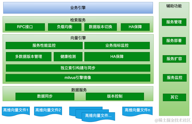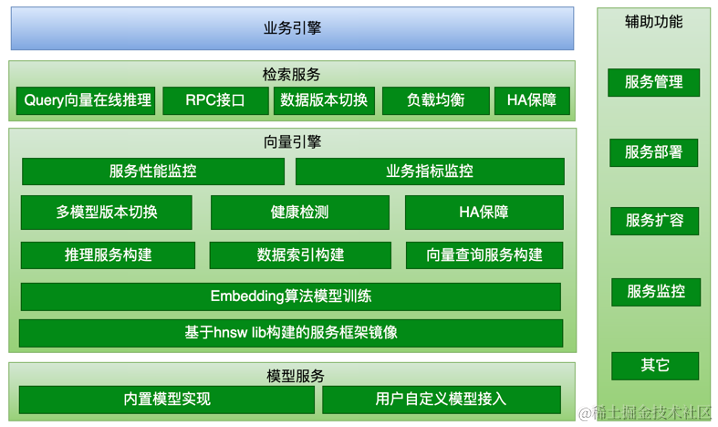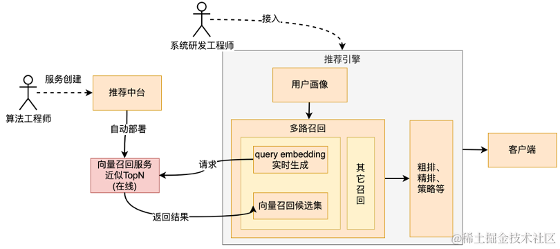 对于单业务支撑而言,我们只需考虑如何搭建起一个向量召回服务,从而能对海量embedding数据进行top N检索,同时保证服务的高性能即可。而对于推荐中台而言,在服务于多业务的情况下,需要在此基础之上再考虑如何将这个服务的搭建与运维简易化、自助化、自动化以及平台化。